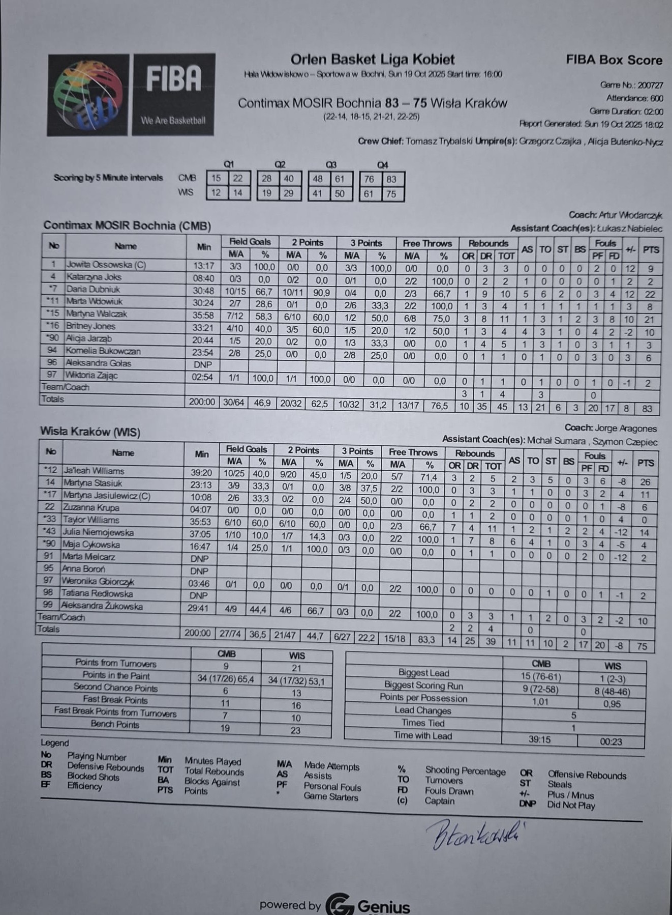| 15 | Martyna Walczak | 21 | 35:58 | 6/10 | 60.0 | 1/2 | 50.0 | 7/12 | 58.3 | 6/8 | 75.0 | 3 | 8 | 11 | 1 | 3 | 8 | 3 | 1 | 2 | 1 | 26 | 10 | |