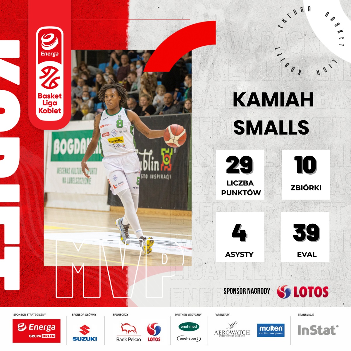 Kamiah Smalls z Pszczółka Polski Cukier AZS UMCS Lublin wybrana została MVP 7. kolejki Energa Basket Ligi Kobiet, a jej drużyna w meczu kolejki pokonała wicemistrza Polski z Polkowic! Smalls zapisała na swoim koncie 29 punktów, 10 zbiorek oraz 4 asysty.