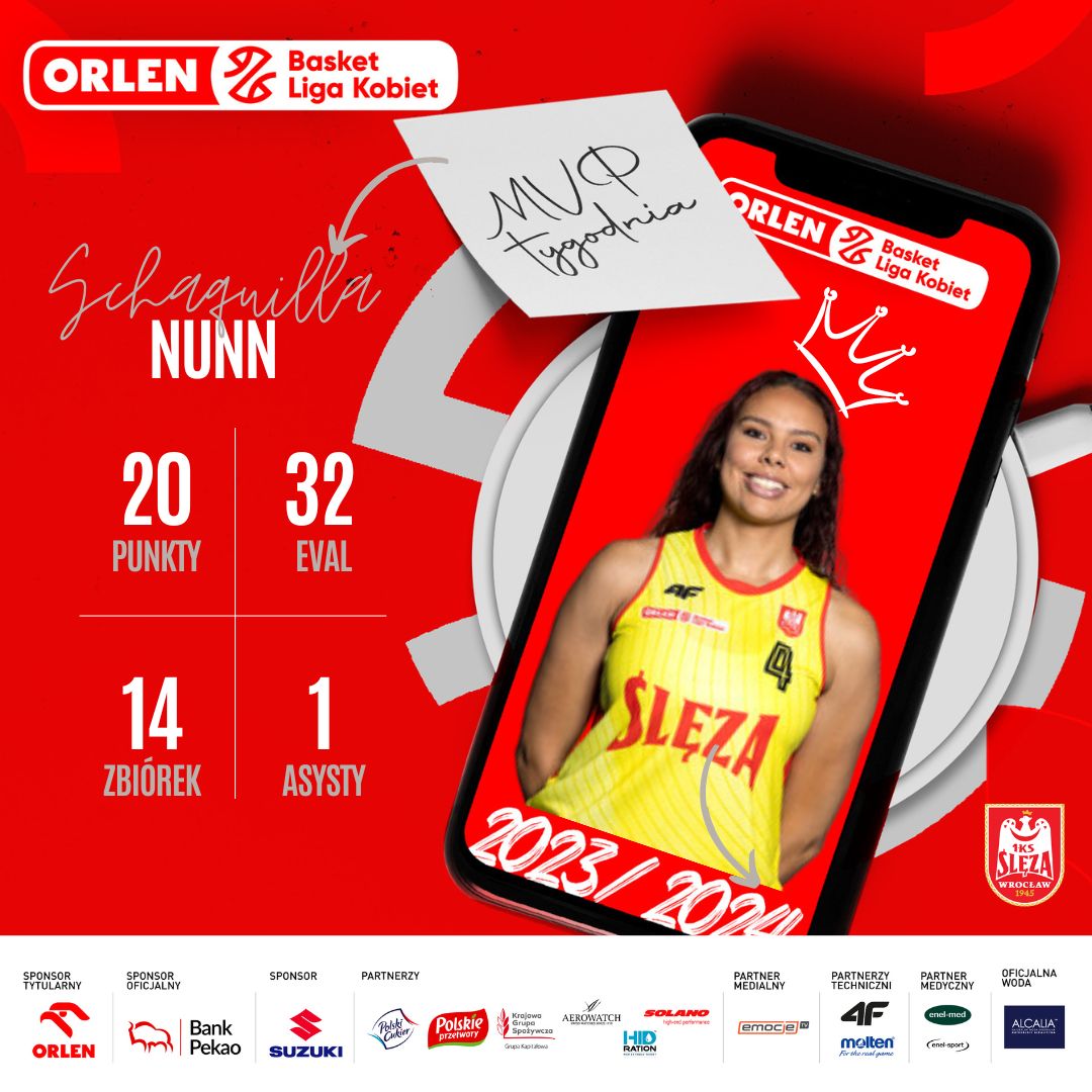 Schaquilla Nunn z 1KS Ślęza Wrocław wybrana została MVP 8. tygodnia #ORLENBasketLigaKobiet, rzucając w wygranym 81:72 meczu z zespołem z Gorzowa Wlkp.