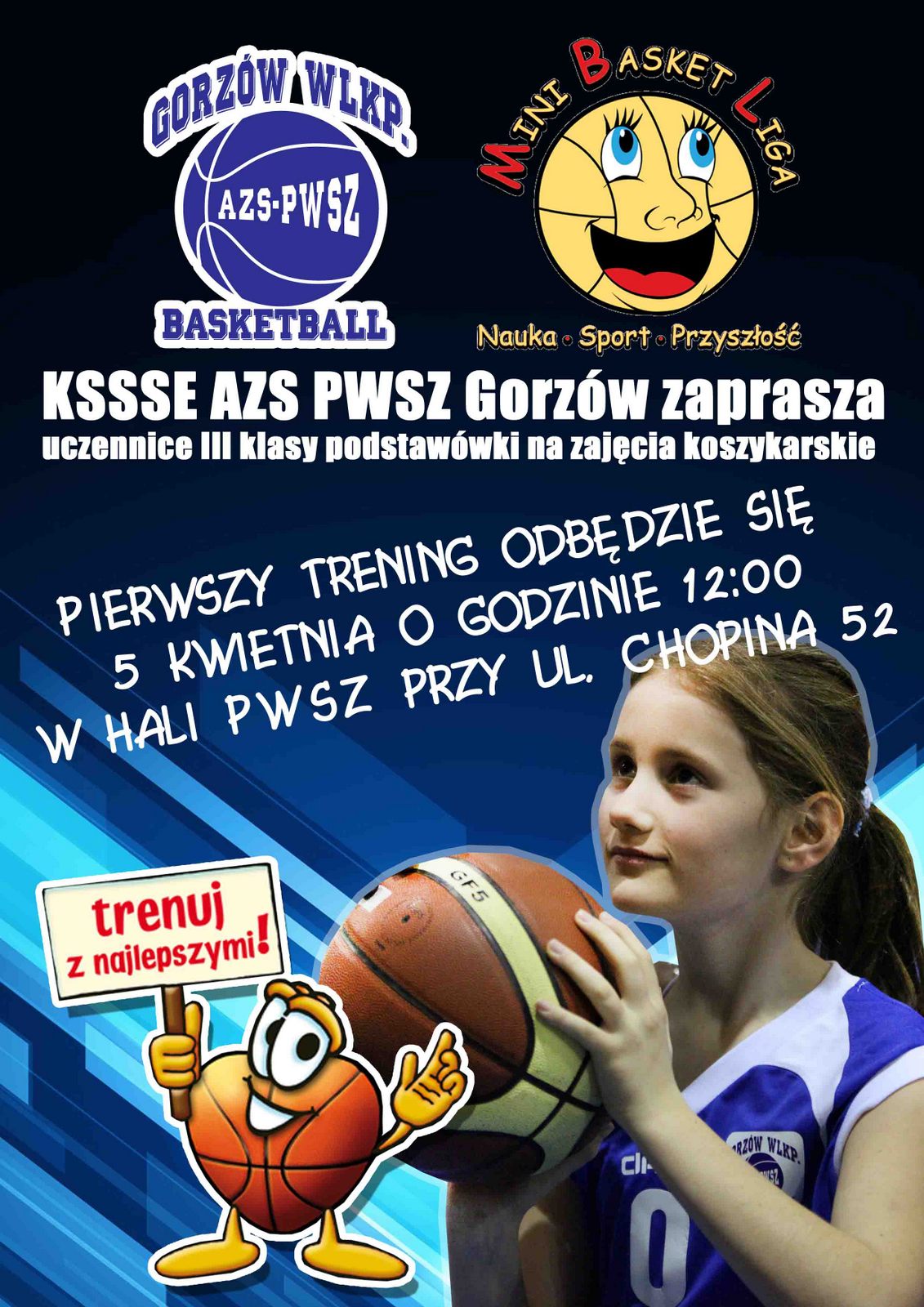 Zatem jeśli macie córki, siostry lub koleżanki z rocznika 2004 to w naszym imieniu zaproście je na pierwszy trening grupy środowiskowej, który odbędzie się w sobotę 5 kwietnia o godzinie 12:00 w hali PWSZ przy ul. Chopina w Gorzowie. Ewentualnie pytania na temat nowotworzonej grupy prosimy kierować do trenera Janusza Kopaczewskiego na adres mailowy: kopaczewski@azspwszgorzow.pl lub telefonicznie 507 875 539.