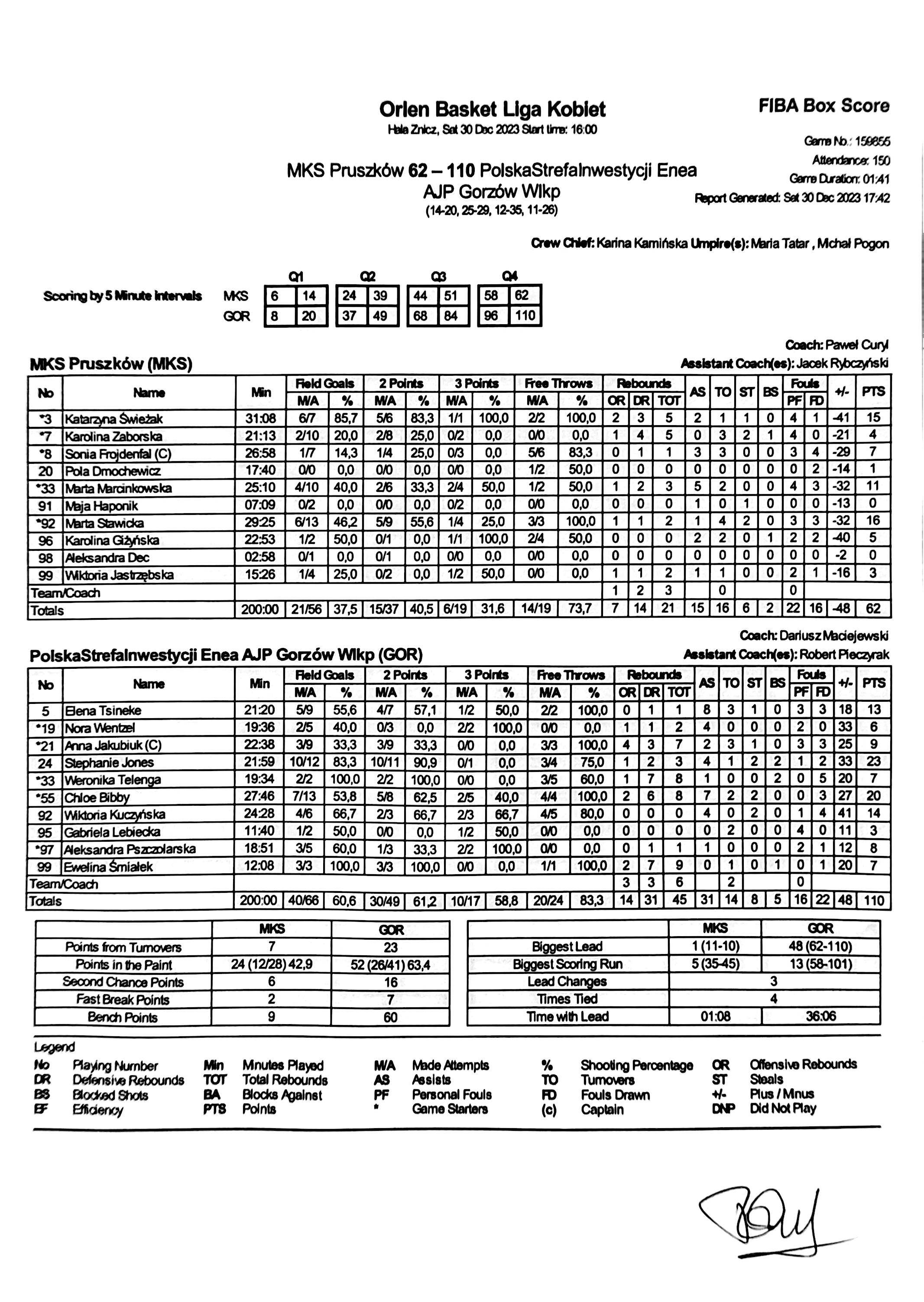 | 33 | Marta Marcinkowska | 11 | 25:10 | 2/6 | 33.3 | 2/4 | 50.0 | 4/10 | 40.0 | 1/2 | 50.0 | 1 | 2 | 3 | 5 | 4 | 3 | 2 |   |   |   | 10 | -32 | |
