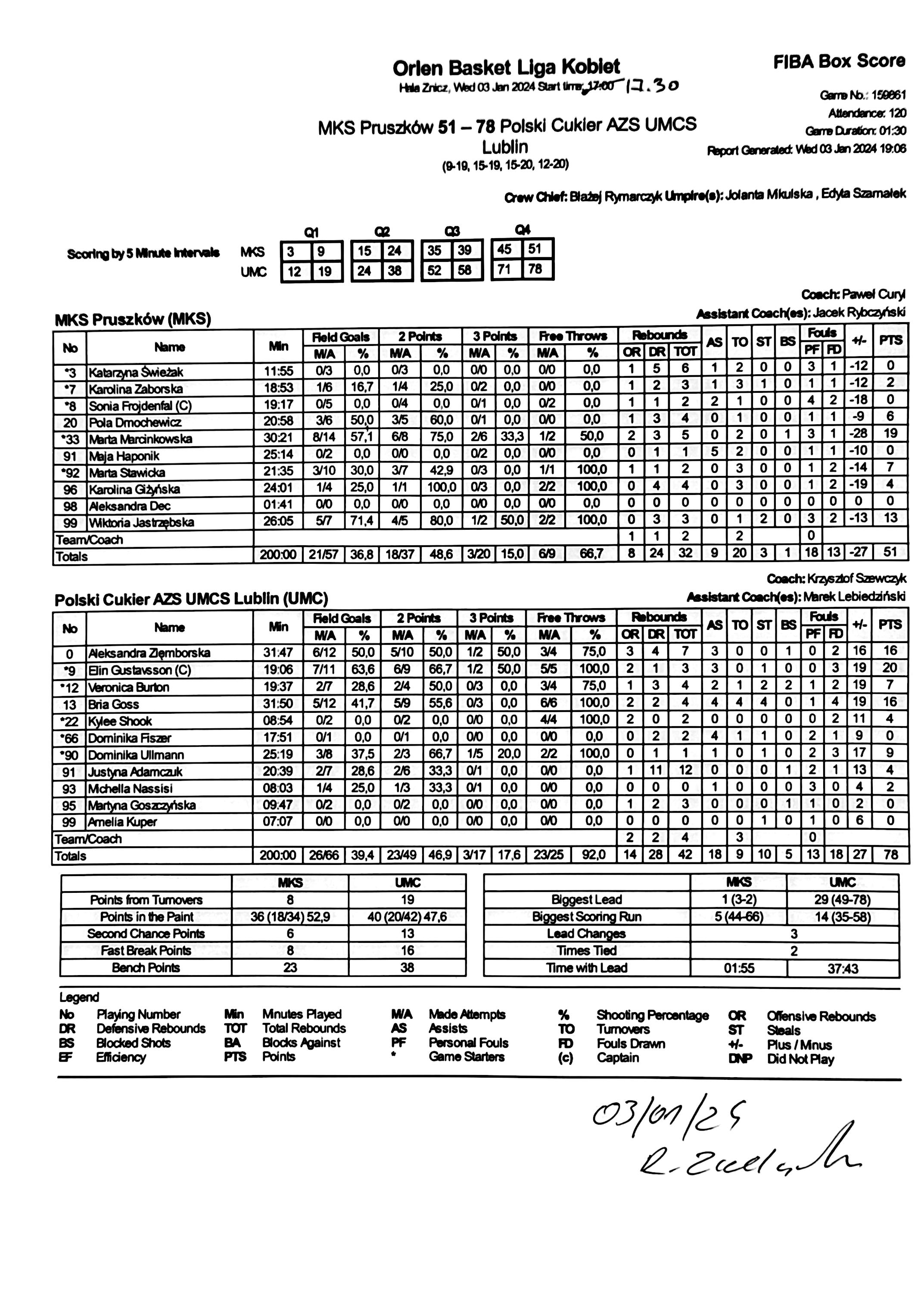 | 66 | Dominika Fiszer | 0 | 17:51 | 0/1 | 0.0 |   |   | 0/1 | 0.0 |   |   |   | 2 | 2 | 4 | 2 | 1 | 1 | 1 |   |   | 5 | 9 | |