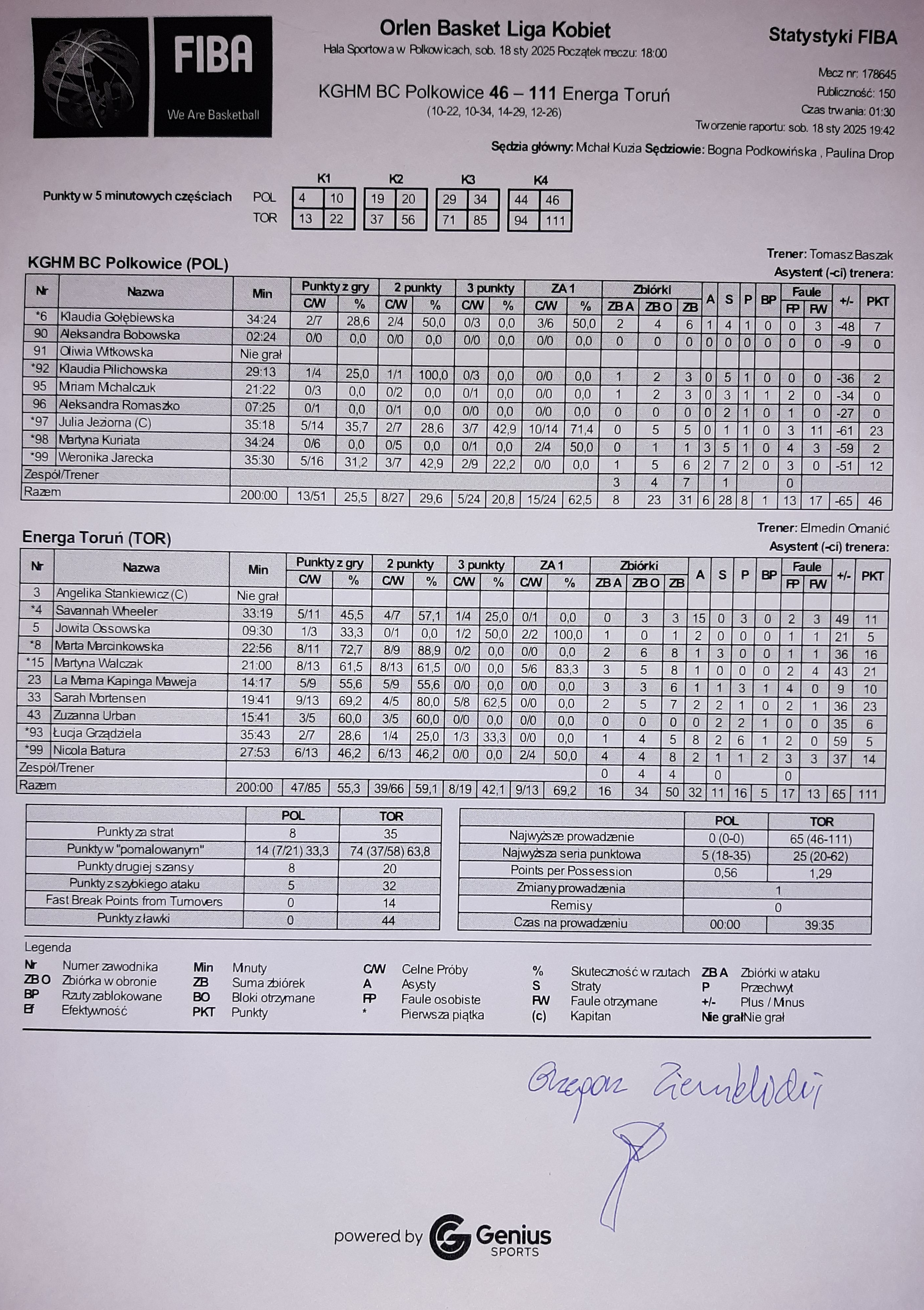 | 0 | 09:35:00 | 2 | 8, M. Marcinkowska, celny lay-up | |