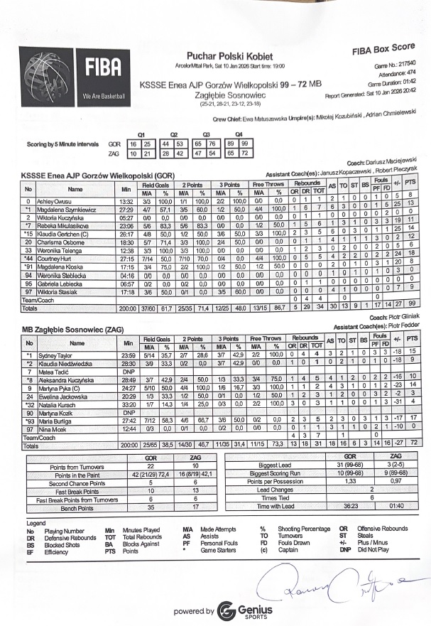 | 2 | Klaudia Niedźwiedzka | 9 | 28:30 | 0/2 | 0.0 | 3/7 | 42.9 | 3/9 | 33.3 |   |   | 1 |   | 1 |   | 1 |   | 2 | 1 |   |   | 3 | -18 | |